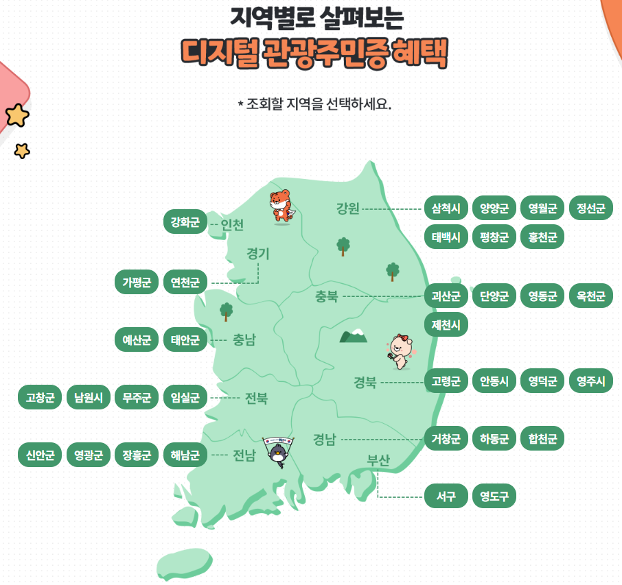 - 관광주민증을 발급받을 지역을 선택합니다. 여러 지역을 동시에 선택할 수 있습니다.