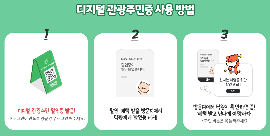 - 디지털 관광주민증 확인: '대한민국 구석구석' 웹사이트나 모바일 앱에서 발급받은 디지털 관광주민증을 확인합니다.