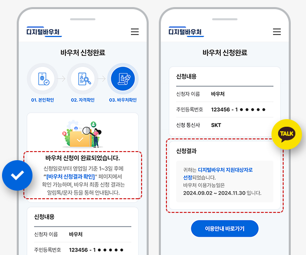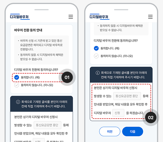 - 다양한 디지털 서비스 이용: 바우처는 통신요금뿐만 아니라 단말기 할부금, 통신사 부가서비스, 제휴상품, OTT, 음원, 도서 등 다양한 디지털 서비스에 사용할 수 있습니다.
