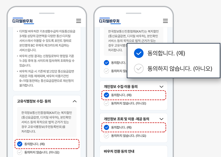 2. 신청 조건 해당 여부 체크와 개인정보 이용 동의 여부 체크
