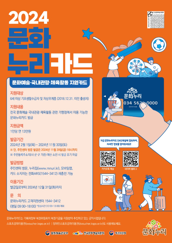 문화누리카드는 문화체육관광부에서 제공하는 복지카드로, 경제적으로 어려운 계층에게 문화, 여가, 스포츠 활동을 지원하기 위해 마련된 제도입니다. 주로 기초생활수급자와 차상위계층을 대상으로 하며, 이 카드를 통해 영화, 공연, 서적, 여행, 스포츠 관람 등 다양한 문화생활을 즐길 수 있습니다. 2024년에는 지원 금액이 늘어나 한층 더 풍성한 문화 생활을 누릴 수 있게 되었습니다.