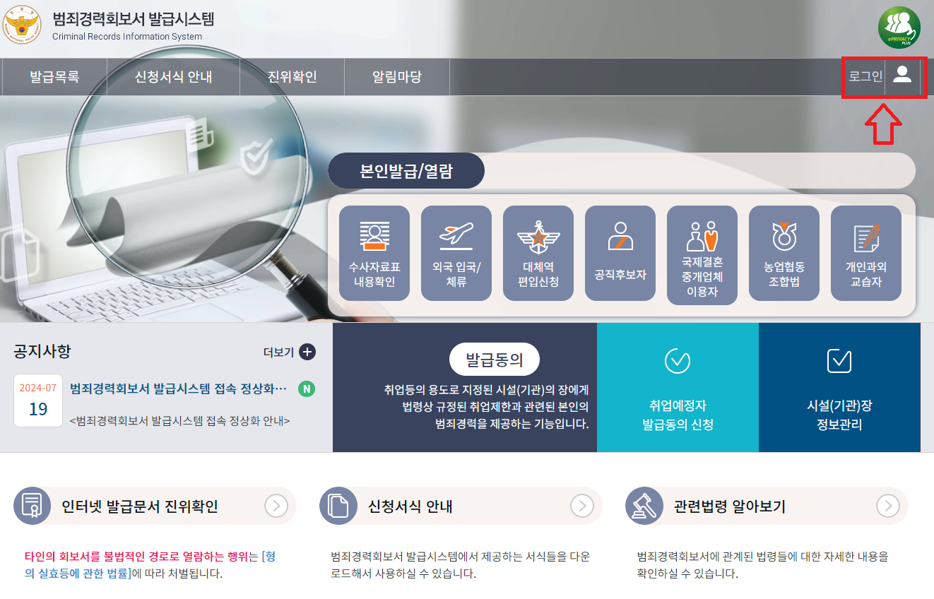 1. 범죄경력회보서 발급시스템 홈페이지 접속 후 오른쪽 상단 로그인 클릭