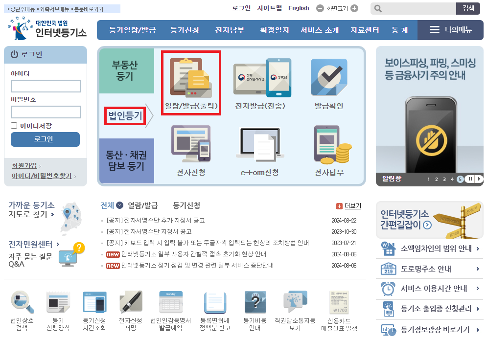 3. 등기부등본 열람 및 발급: 메뉴에서 법인등기 > 열람/발급(출력)을 선택합니다.