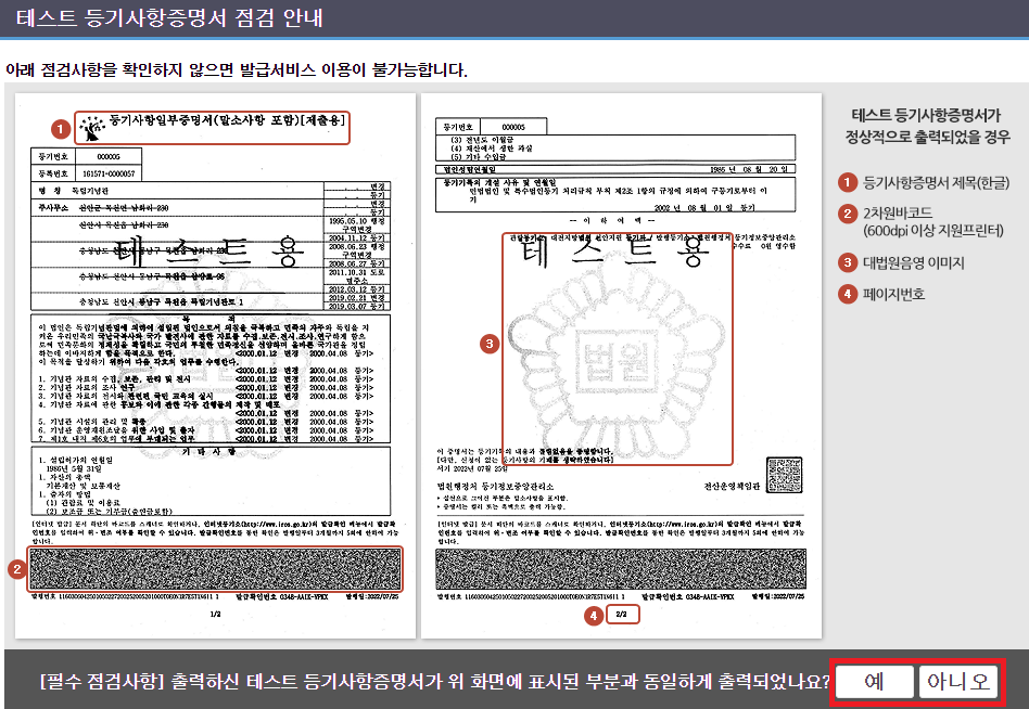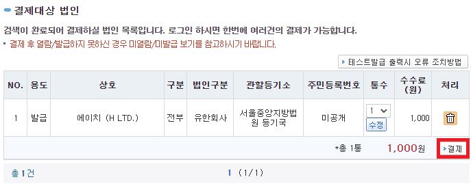 7. 결제: 테스트 등기사항증명서를 출력하고 차례를 따라 결제를 합니다.