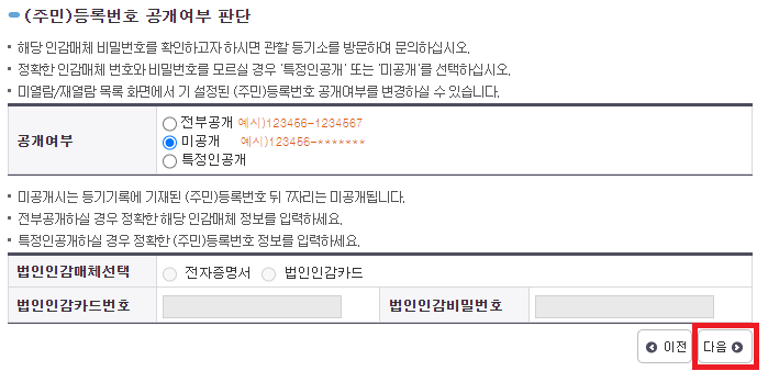 6. 항목선택: 필요항목에 체크를 하고 등록번호 공개여부 선택과 발급항목 확인을 합니다.