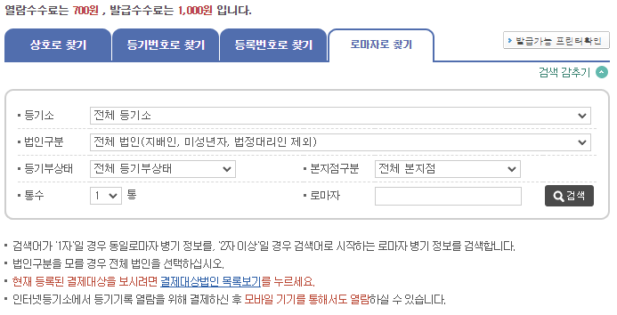 4. 검색하기: 왼쪽 메뉴에서 발급하기를 선택 후 상호, 등기번호, 등록번호, 로마자로 찾기 중 선택하여 입력 후 검색합니다.