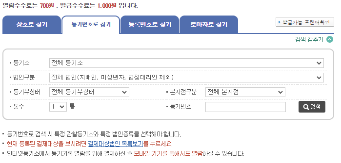 - 법인 정보: 발급받고자 하는 법인의 상호, 등기번호, 등록번호, 로마자 중 하나를 알아야합니다.
