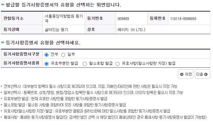 5. 법인상호 선택: 검색결과를 확인하고 법인상호를 선택한 뒤 등기사항증명서 유형을 선택합니다.