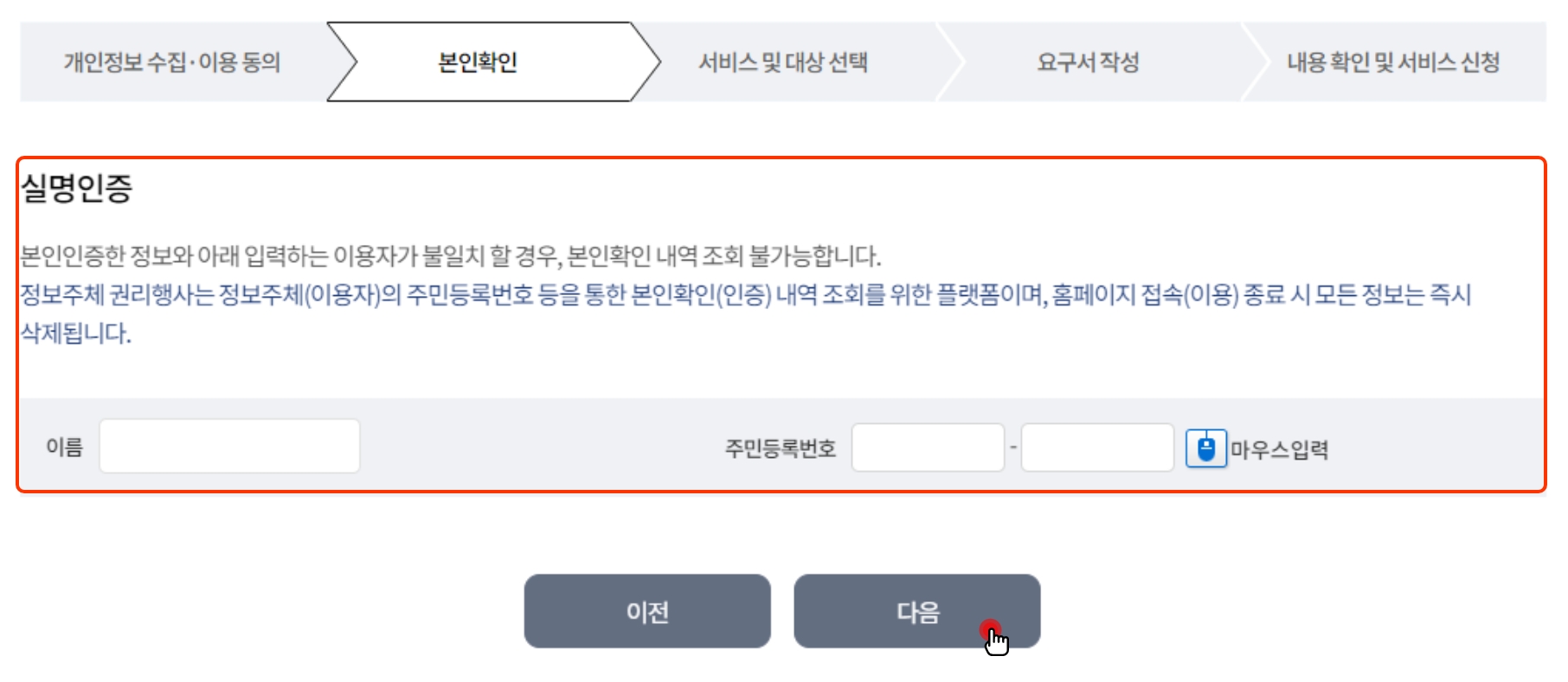 - 개인정보 포털에서는 별도의 로그인 없이 본인인증으로 서비스를 이용할 수 있습니다.
