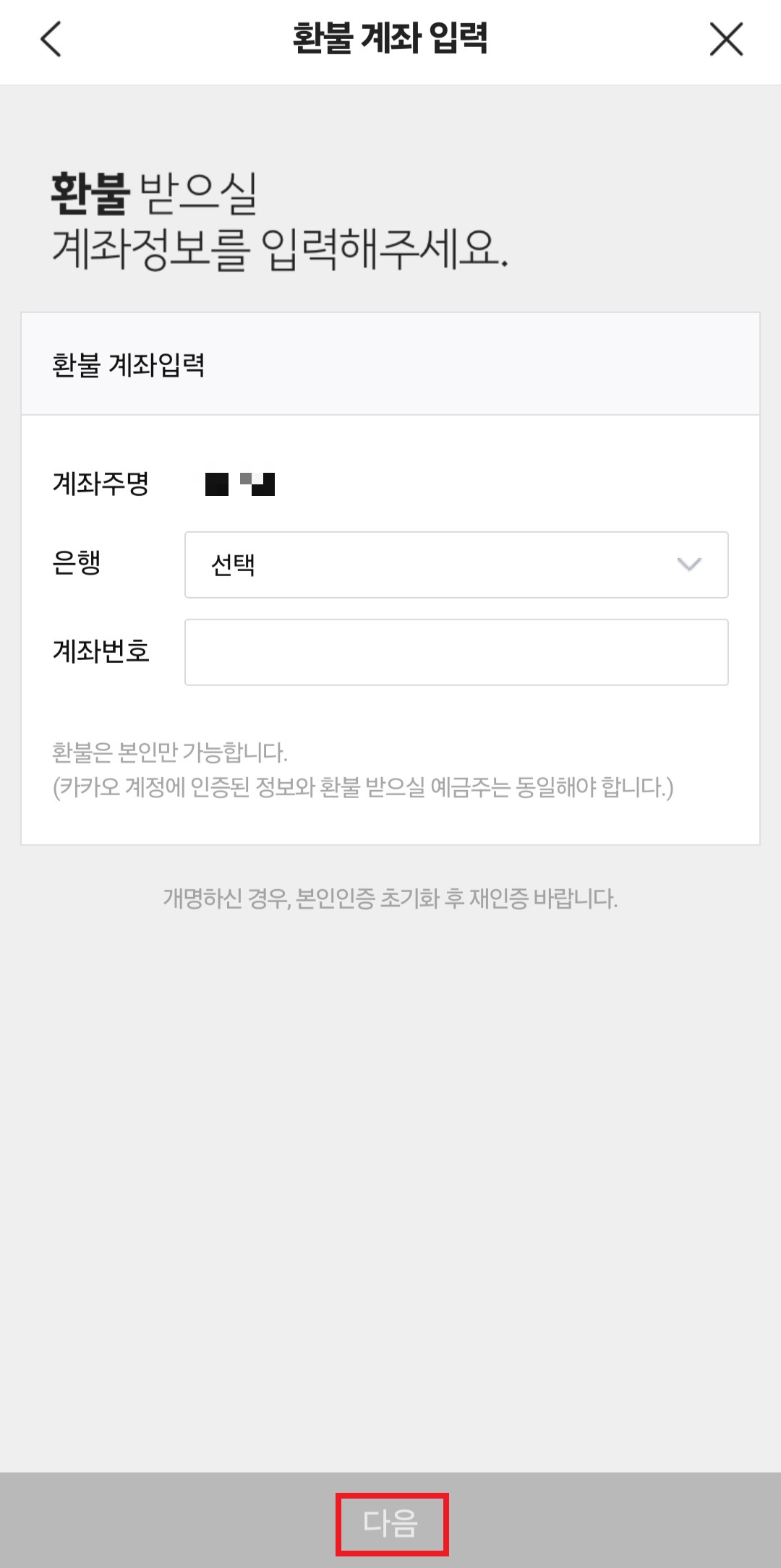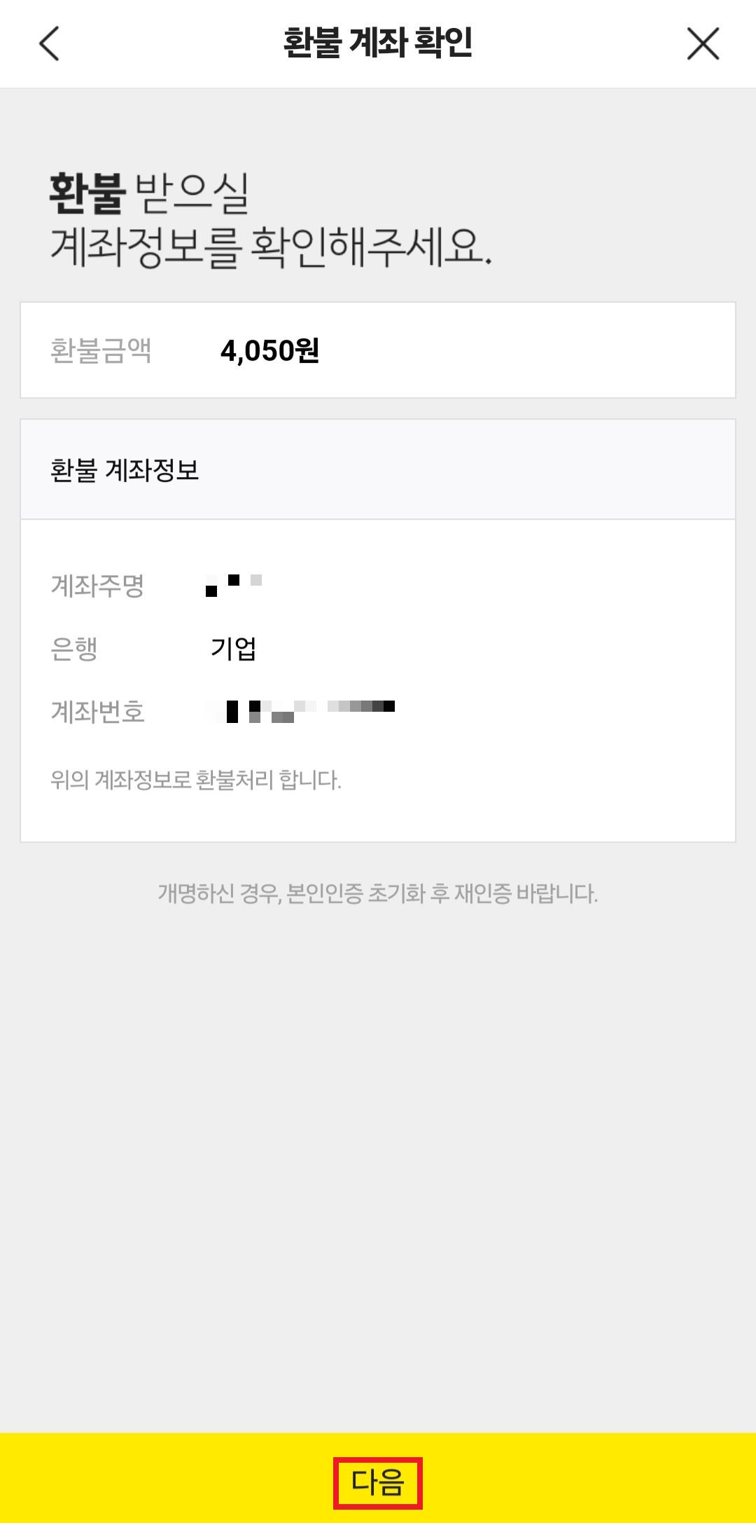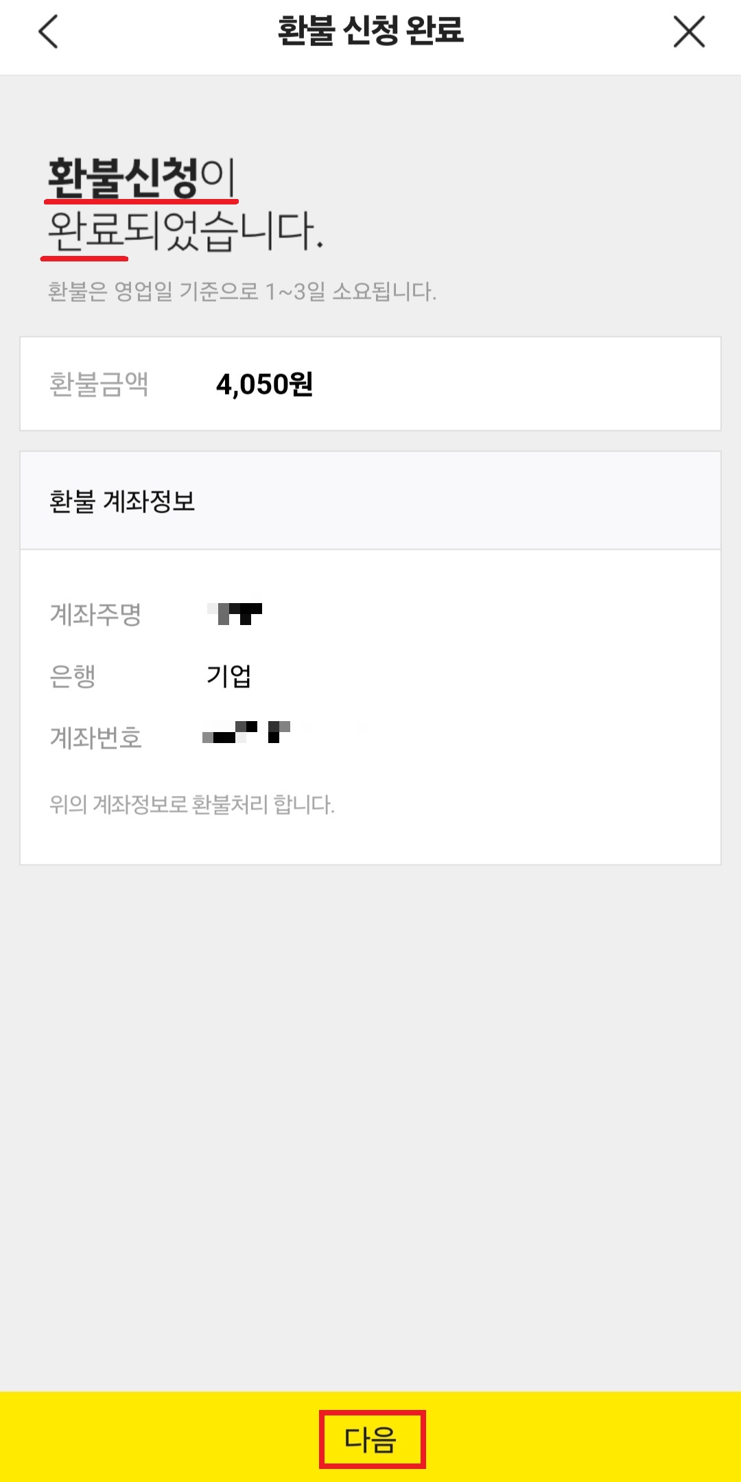 4. 입력한 환불 계좌를 확인하고 다음을 누르면 환불신청이 완료됩니다.