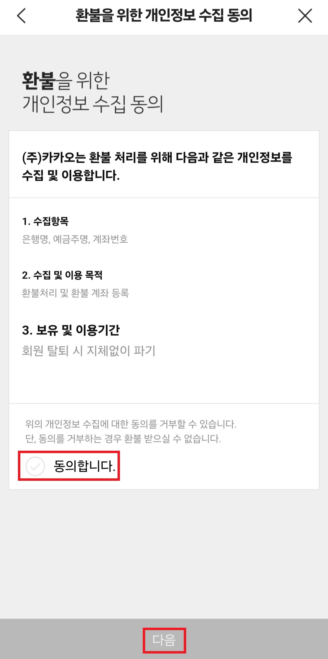 3. 개인정보 수집 동의에 동의 후 환불 계좌 정보를 입력합니다.